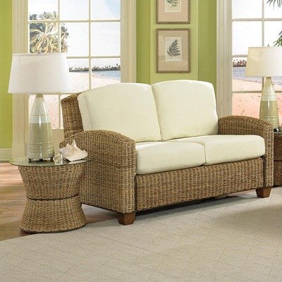 5401-60 Loveseat only. View end table here Features: -Made of all natural woven banana leaves.-Easy to assemble.-Ships in 3 UPS cartons.-Note: Not recommended to be put outside where it will be exposed to the elements of rain, snow, or bad weather. It will however be ok to place outside under a covered patio.-Chair and Ottoman.-Chair, Ottoman and Loveseat.-2 Chairs and a loveseat.-Chair, Ottoman, Loveseat and end table. Options: -In a honey finish, also available incocoa. Color/Finish: -Cotton twill fabric cushion in ecru color. Dimensions: -Overall dimensions: 31.75 H x 53.75 W x 36 D.