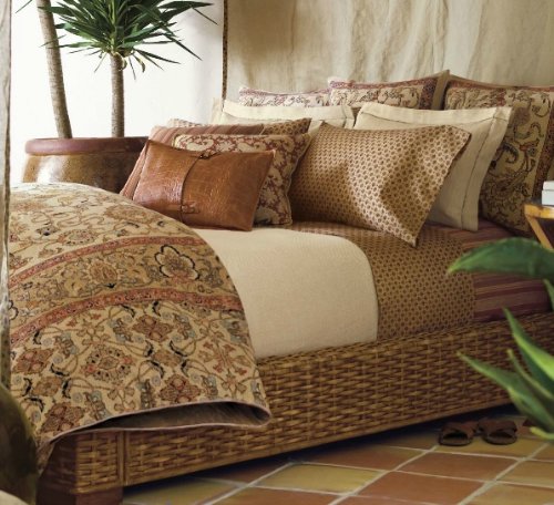 An intricate Persian rug pattern with raw jute piping infuses an air of worldly romance into our Northern Cape collection. With an exotic look that evokes the breathtaking beauty of the Moroccan desert, the Northern Cape bedding collection brings eclectic sophistication to your bedroom decor. The collection features an intricate woven jacquard motif in muted blue, brick red and olive on a sandy natural ground, reminiscent of a luxurious Persian rug. Embroidered details and leather accents complete the look. The Northern Cape collection has everything you need to bring this beautiful look to your bedroom. Fitted sheet is made from the Terra Cotta stripe coordinating fabric.